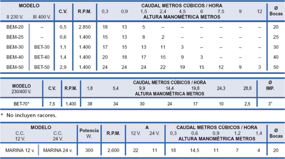 • Motor cerrado, protección IP-42 (Bem-20 y 25 también en IP-55) , ventilación exterior, servicio continuo, aislamiento clase B, conmutador para cambio de sentido, los monofásicos incorporan condensador y motoprotector amperimétrico.