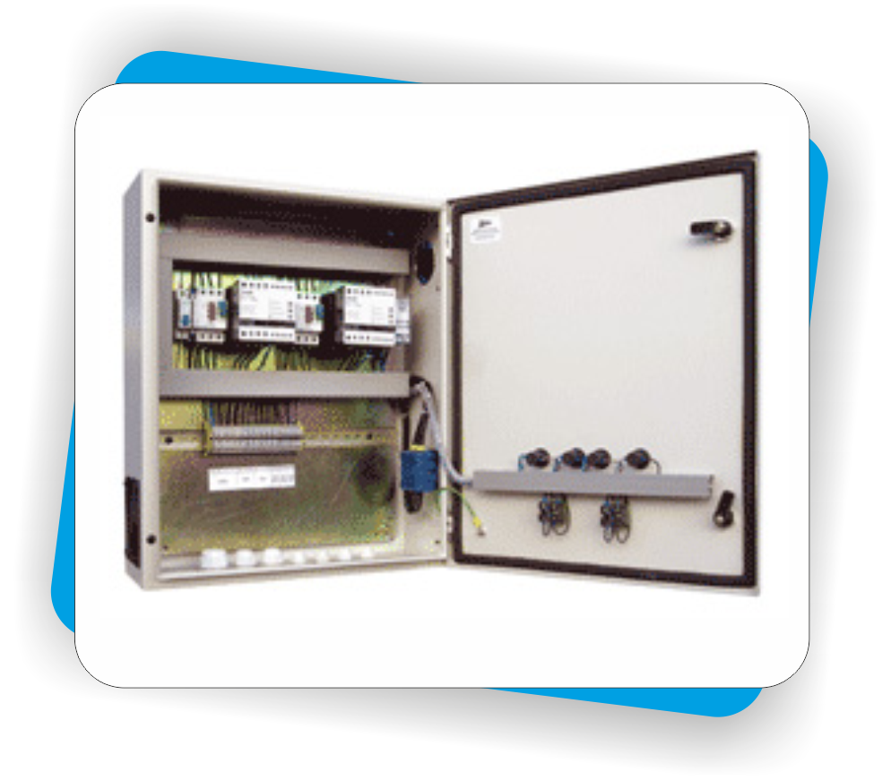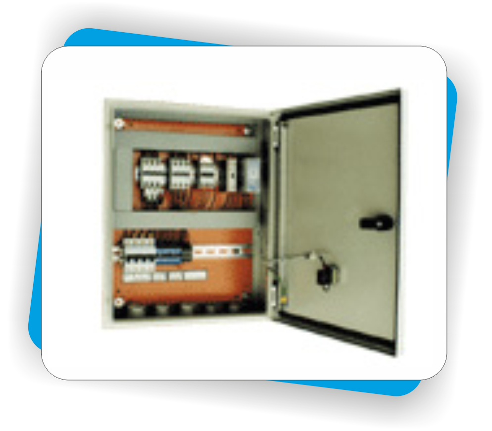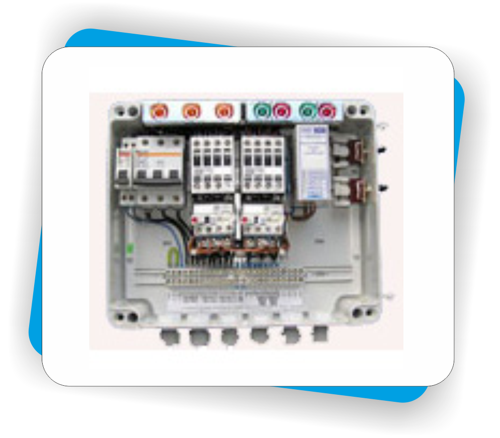 • Tres contactores y relé térmico Danfoss, interruptor magneto-térmico, relé de sondas pozo, tres electrodos, interruptor M-0-A, pilotos señalización, todo en caja de material plástico IP-54.