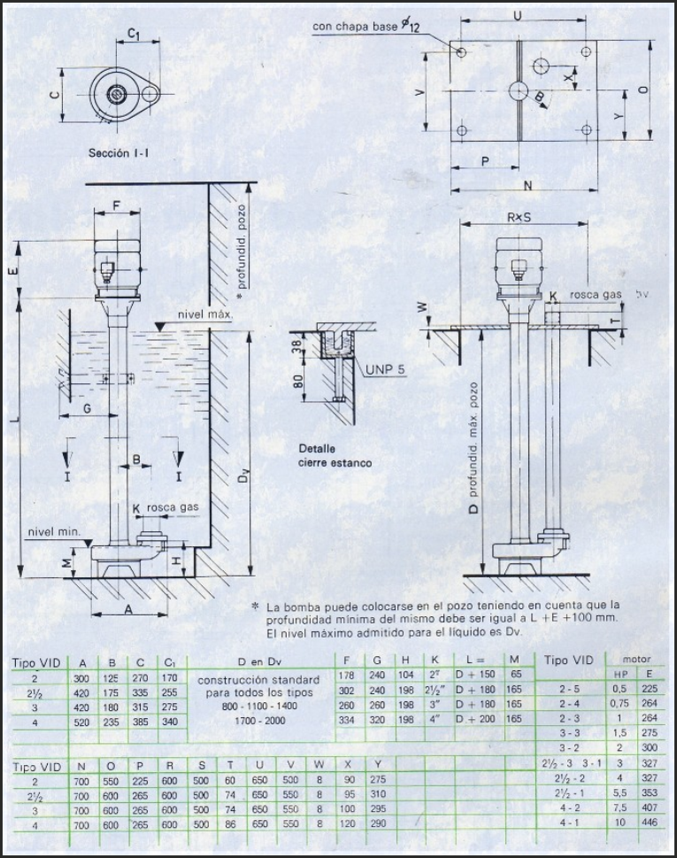 -Para profundidades de inmersión hasta 2 mts. (en modelo vid-2 hasta 1,4 mts.) la bomba se construye sin cojinete intermedio. Sólamente para pozos muy profundos en los que se necesitan bombas de gran longitud, se construyen con cojinete intermedio lubrificado por grasa.